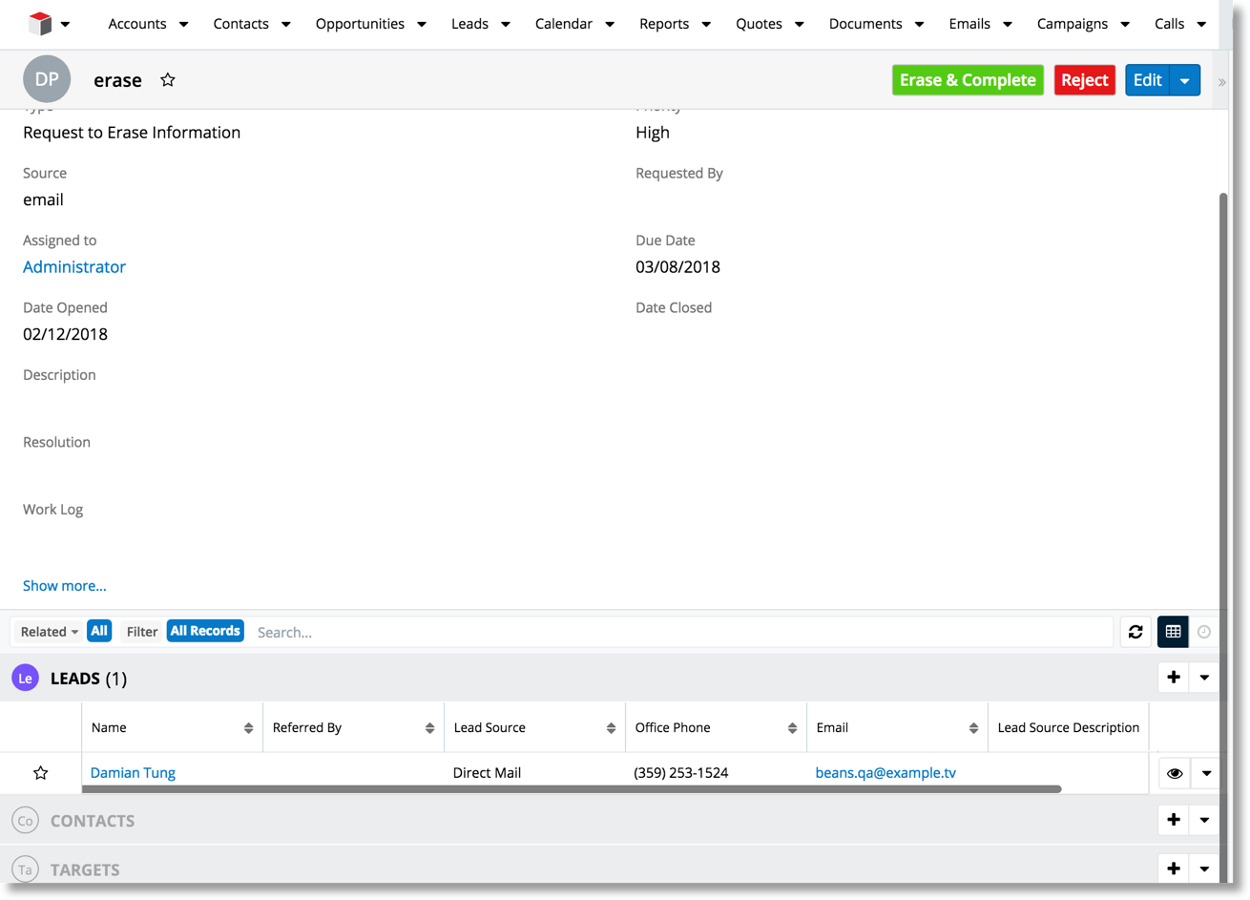 Recording Data Subject Requests – In Sugar 8.0, we are adding a new Data Privacy module. This module is sort of a command center where Sugar users can manage certain requests by customers related to data privacy. The module will also serve as a record of actions taken to address those requests.