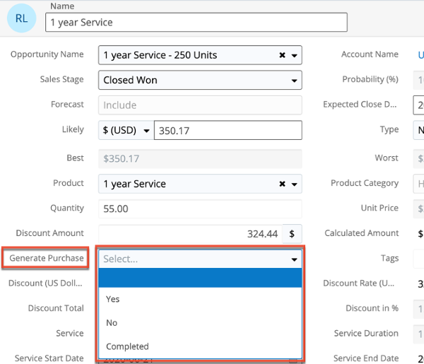 The Generate Purchase field is hidden by default on the Revenue Line Items record view. If you would like to give users access to this field, an admin user will need to add it to the view via Admin > Studio > Revenue Line Items > Layouts > Record View. The picture below represents what a user will see in edit mode on the record view when the Generate Purchase field is available. The default value for newly created records is "Yes". However, records existing prior to update will have a blank value which the users can choose to update as appropriate. Once the purchase data has been generated, the value will automatically update to "Completed". For more information, refer to the Studio page in the Administration Guide.
