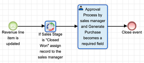 As an admin user, you can choose to modify the Generate Purchase field's default behavior via Admin > Studio > Revenue Line Items > Fields > Generate Purchase. Additionally, you can incorporate the field into SugarBPM by utilizing Process Business Rules and Process Definitions to leverage internal processes you have established or would like to create prior to moving forward. For additional information, refer to the SugarBPM page in the Administration Guide. The following steps illustrate and example of utilizing those capabilities together: