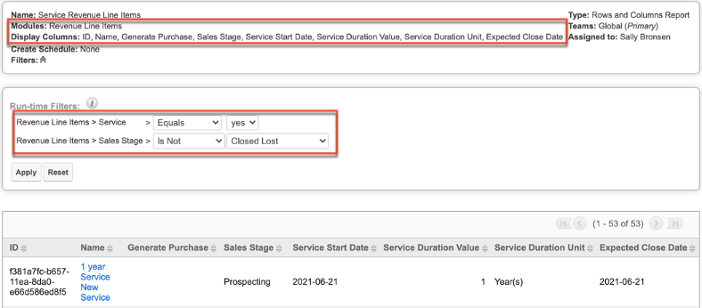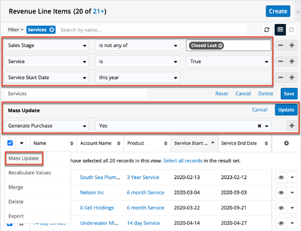 The ability to mass update the Generate Purchase field in revenue line items is available to all users by default. When considering populating the Active Subscriptions dashlet with automatically generated purchase data, we recommend an admin user add the Sales Stage, Service, and Service Start Date fields to the Search layout by navigating to Admin > Studio > Revenue Line Items > Layouts > Search. When used as a filter set and selecting the values which are appropriate for your business use case (e.g. this year, this month, last 7 days, etc), these fields will help you identify the records you want to mass update. For more information on Mass Update, please refer to the User Interface page in the Application Guide.