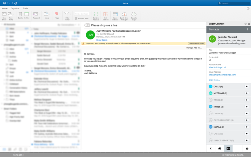 Sugar Connect harmonizes your CX applications by surfacing key customer data and activities into the apps you use most — email and calendaring. As a key component of Sugar’s No-Touch Information Management vision, Connect provides critical context when it matters most, during real-time email communications with customers. Further, it keeps all of your customer account information up to date without ever having to leave your email tool. Connect synchronizes Microsoft Office 365 and Google G Suite data directly with Sugar Sell, Serve, Enterprise, and Pro, incorporating email, calendar events, tasks, and contacts into the unified customer view provided by the Sugar platform.