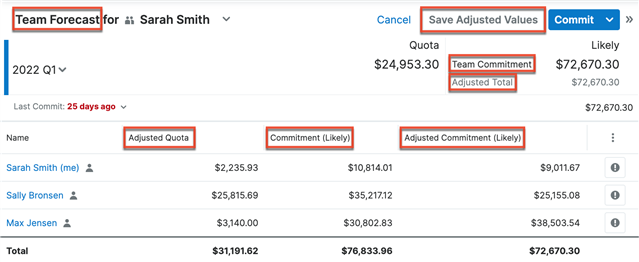 A button on the team worksheet that appears after editing an Adjusted Quota or Adjusted Commitment field in the list view. |