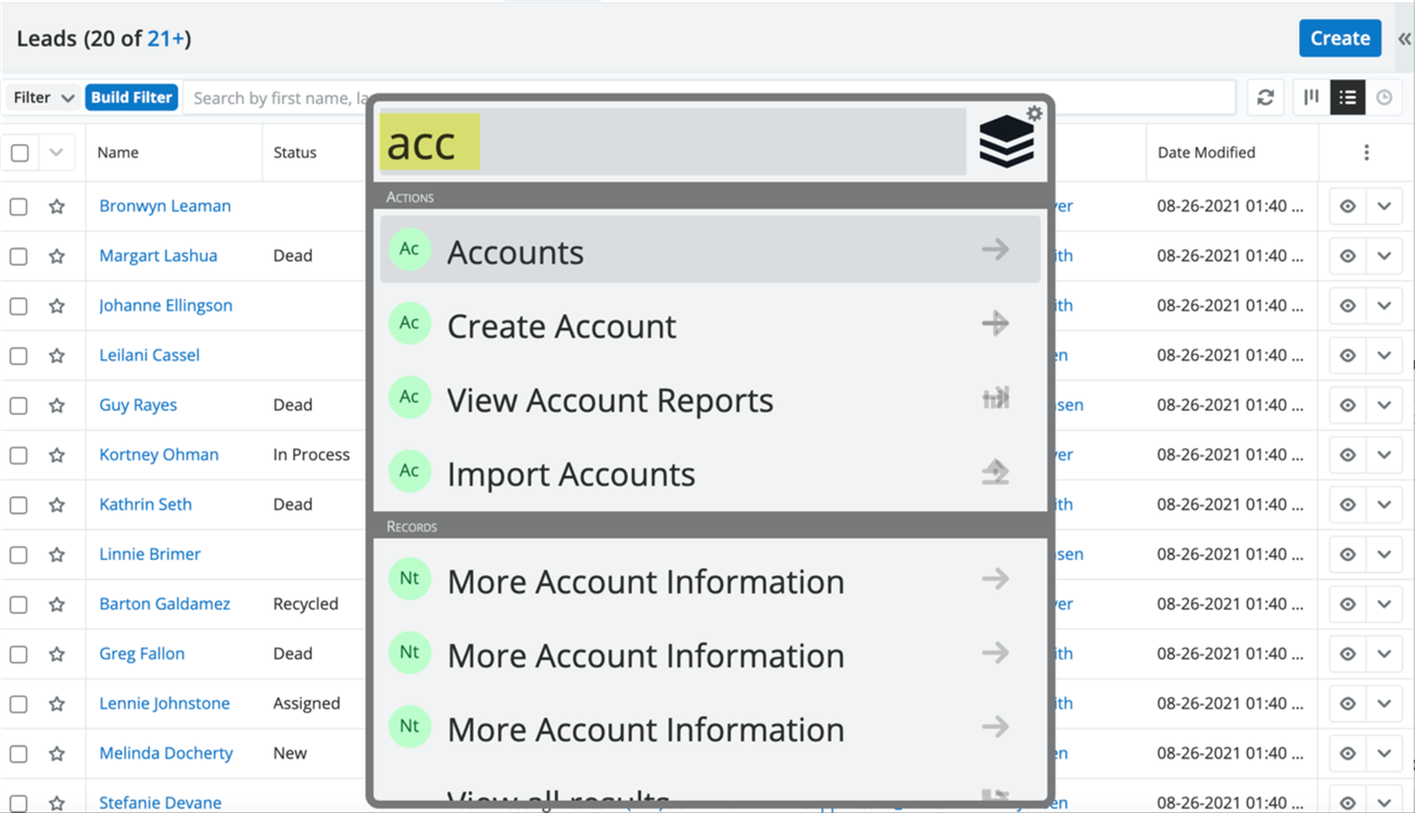 For more targeted searches, Sugar provides module-specific search options in the List View. These searches are fine-tuned to retrieve data relevant to a particular module, such as Accounts or Contacts. You can easily filter and sort these searches to find the exact records you need. This capability ensures that you aren’t overwhelmed with information and can focus on data that’s relevant for your needs.