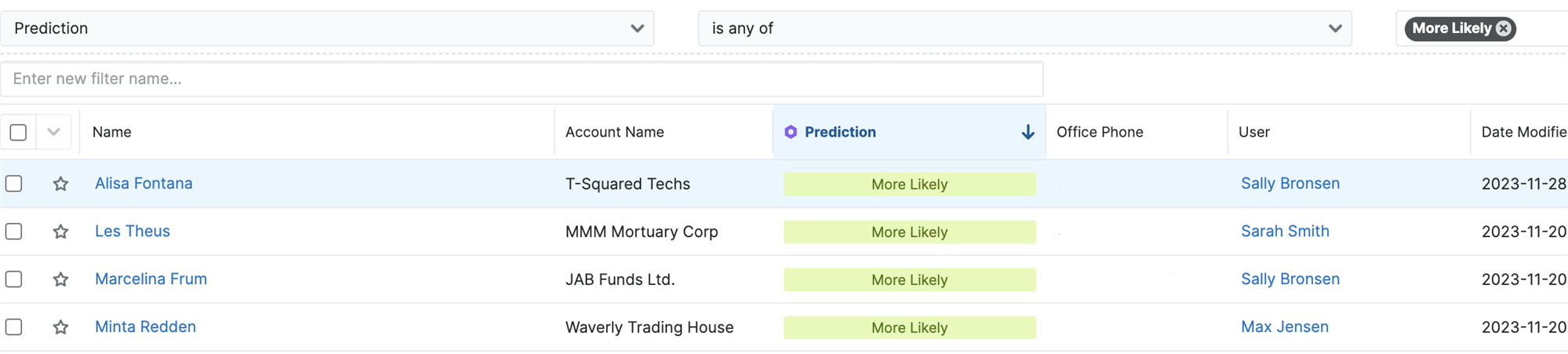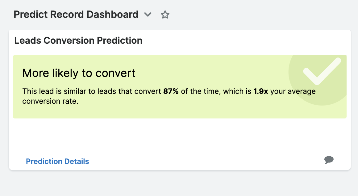 SugarPredict provides insights and projected outcomes for leads and opportunities in the list view and through the Predict dashlet in the record view.