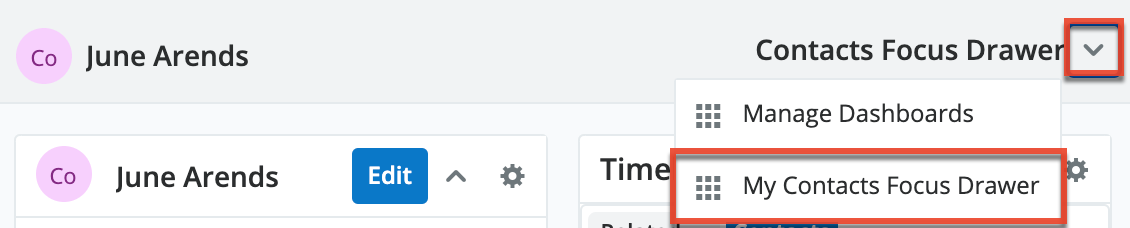 Focus Drawer dashboards can be accessed and managed from the Dashboards list view, which provides an overview of all available dashboards. Users can easily switch between custom and default dashboards to personalize their workspaces.