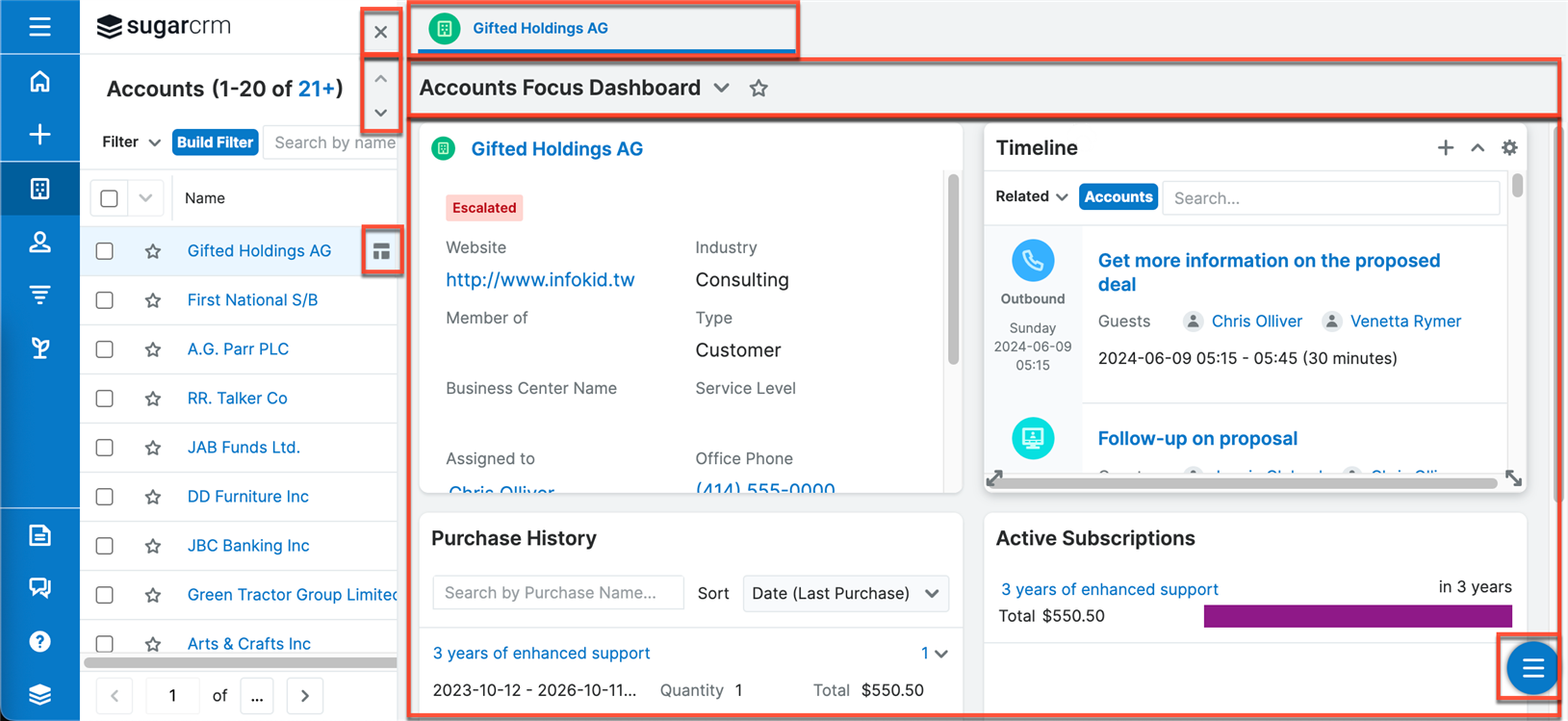 Traditionally, CRM systems have been siloed by different modules that served up various forms of information. This forced users to jump between multiple screens and parts of the platform to access relevant information. SugarCRM's Focus Drawers change this narrative by proactively serving up all the information users need at a glance. This approach ensures an informed, empowered, and highly efficient user experience. No more navigating through multiple windows, screens, or browser tabs and losing context—SugarCRM's Focus Drawers are designed to simplify your work and keep productivity high.