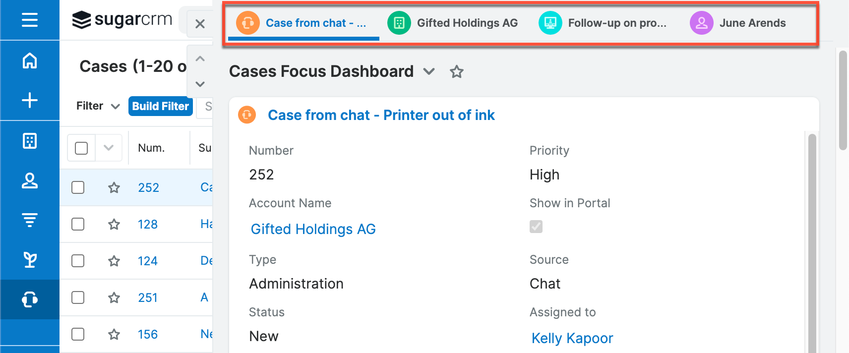 Clicking a link in a Focus Drawer opens the focus record view, which provides a comprehensive look into the record, including the record view's dashlets and subpanels. At the top of the Focus Drawer, page tabs open and remain as needed to provide additional information (much like your Google Chrome or Firefox web browser experience). Each Focus Drawer tab is identified with the corresponding module name and the record's name, providing clarity and context.