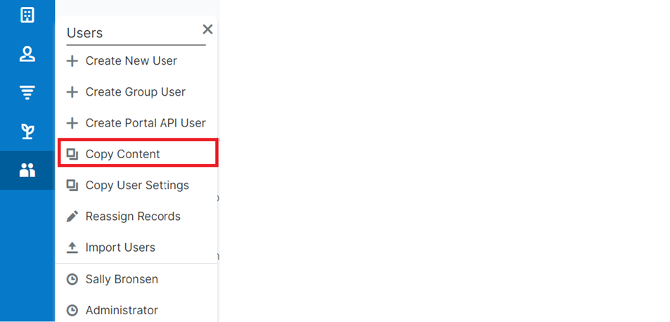 With the “Copy Content” option (pathway Admin > User Management > Users- then find “Copy Content” under the three-dot menu, see image below), admins can easily configure the modules and the order in which they are displayed in the navigation bar by copying over the settings as defined in the source user's layout options. The admin goes to Admin > Navigation Bar and Subpanels to configure the nav bar across all users.