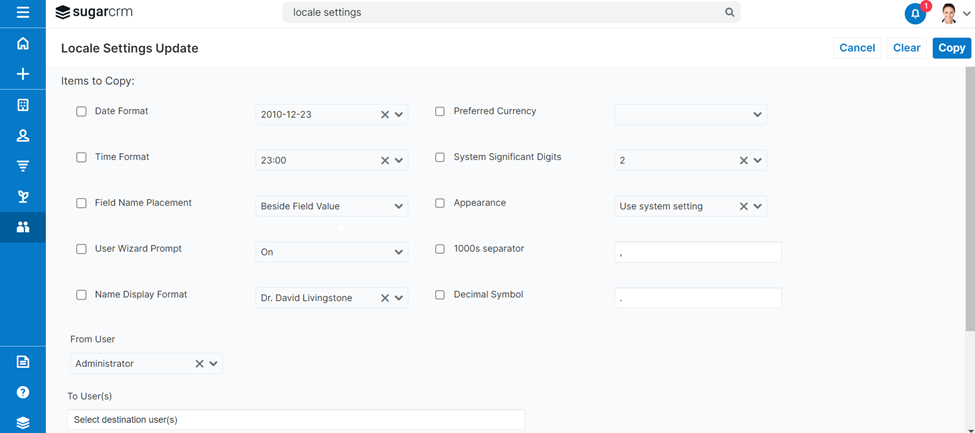 Admins can also copy over user settings like date and time formats, currency formats, and more across users, teams, and roles. So if you’re setting up a new sales team in Italy, for example, it’s easy to push all of their settings out to the full team to get them up and running quickly in the Central European time zone using Euros.