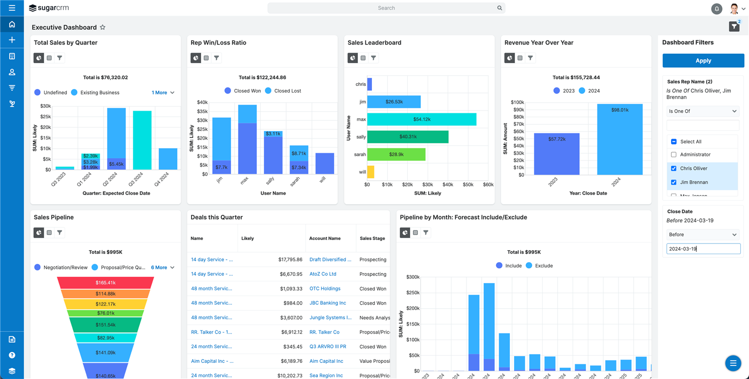 Sugar Sell 14.0 also brings a welcome update for Sell Premier users leveraging Enhanced Forecasting by simplifying data analysis with an integrated dashboard filtering system, previously available for the standard Report dashlet. Sell Premier’s Enhanced Forecasting and reporting capabilities, powered by Sugar Discover, now allow unified dashboard filters to adjust multiple dashlets simultaneously. This means no more juggling between different slicers for each report. A single filter action now updates all relevant dashlets, saving time and reducing complexity. Users can quickly see the effects of their filtering choices, making data-driven decisions more straightforward.