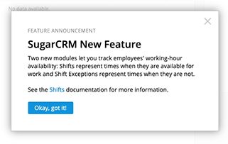For the latter, Sugar 10.1 includes several feature announcements that are presented once to each user to direct them to the documentation for new features. Admins will see a guide on shifts and Round Robin actions when accessing the Process Definitions list view and all users will see a guide on shifts when accessing the Shifts list view. We are including these to bring awareness to new functionality and provide the information needed to quickly take advantage of these new capabilities.