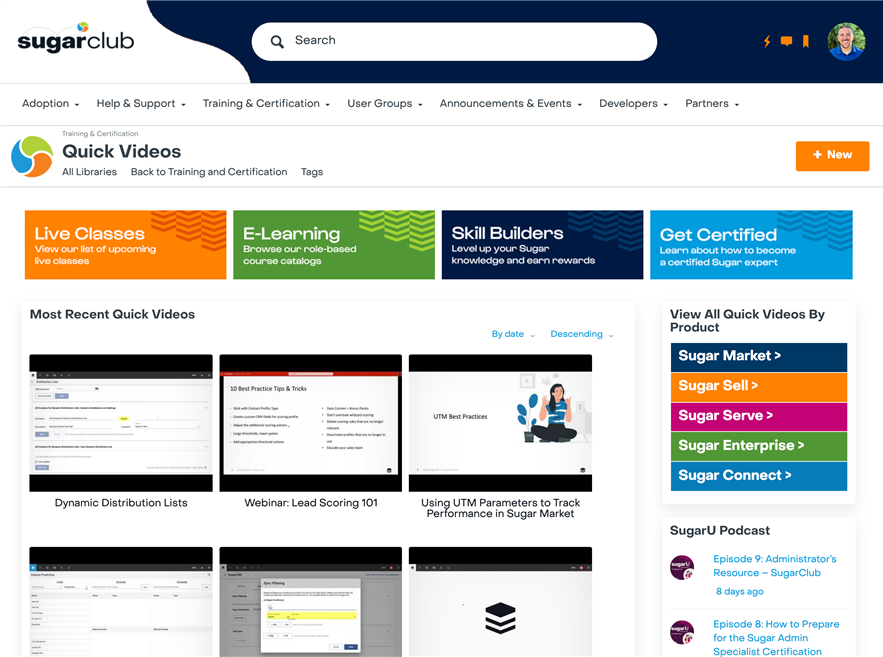 Last year, our team introduced a library of Quick Video tutorials to provide Sugar users with focused, easy-to-digest instructions on how to perform specific actions across the Sugar platform. Since then, based on SugarClub member feedback, we realized that we could improve the way our customers consume these videos, so we've implemented a new design and way to access the library.