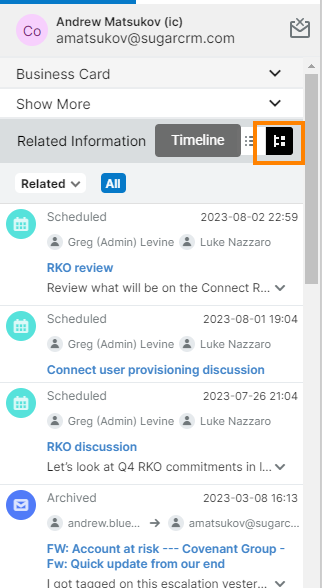 Starting from Q4 2023, you can keep the Timeline view open when viewing records in both Google Workspace and Office 365 until you manually switch back to the subpanel view. This feature will benefit users who prefer the Timeline view, as Sugar Connect sidebar will remember your last choice and present it to you when viewing a new record.