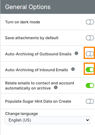 Please note that your administrator can set the default auto-archive behavior for both inbound and outbound emails for their users in the Sugar Connect Portal. If disabled, you will not be able to manage “auto-archive” as a user.