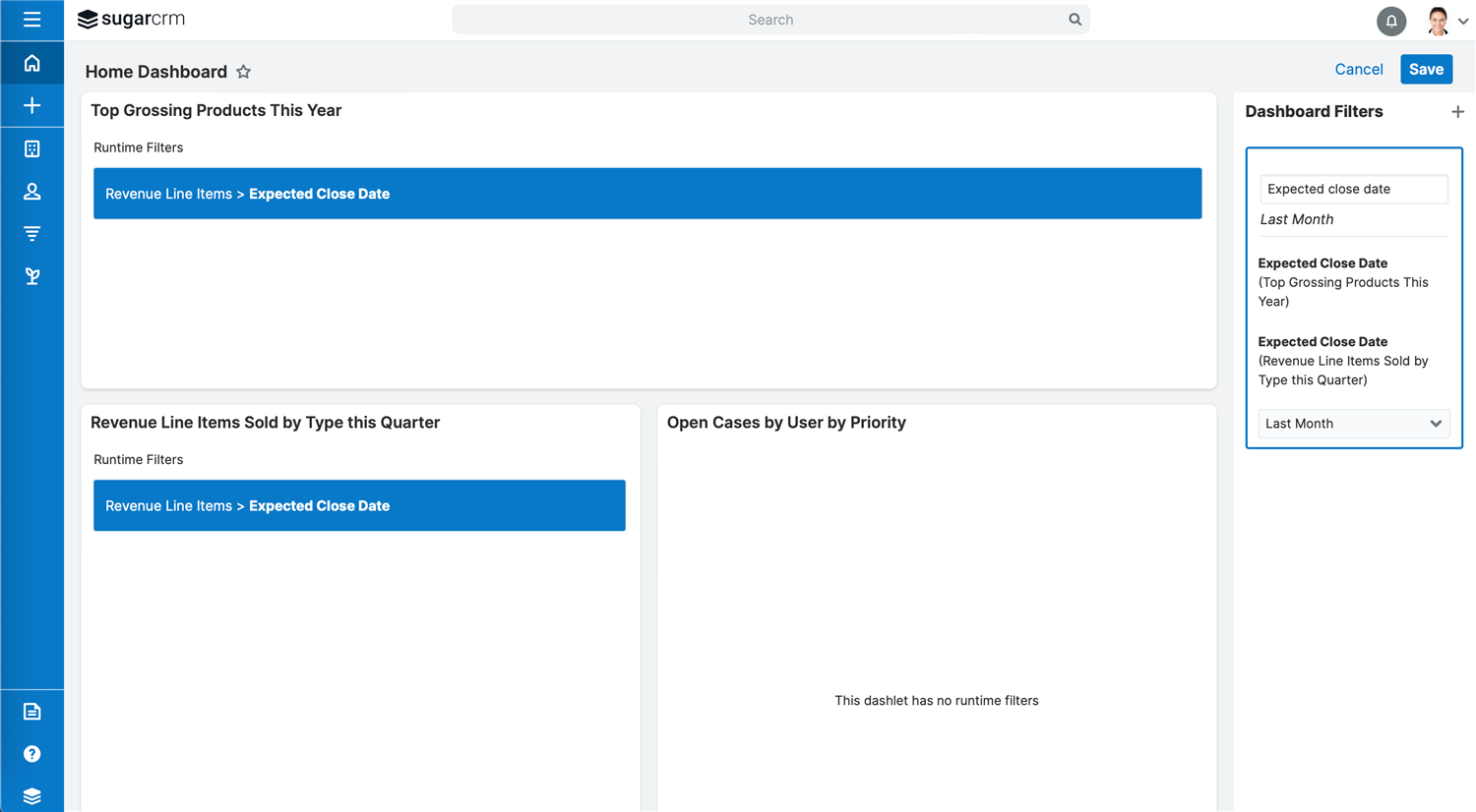 Users may leverage multiple dashboards, each providing a 360-degree view of the linked records most relevant to them through a set of dashlets. Admins usually create shared dashboards for users to monitor the team, region, or industry metrics or to analyze data over a specific period of time. Report dashlets are widely used in dashboards to gather various types of data.
