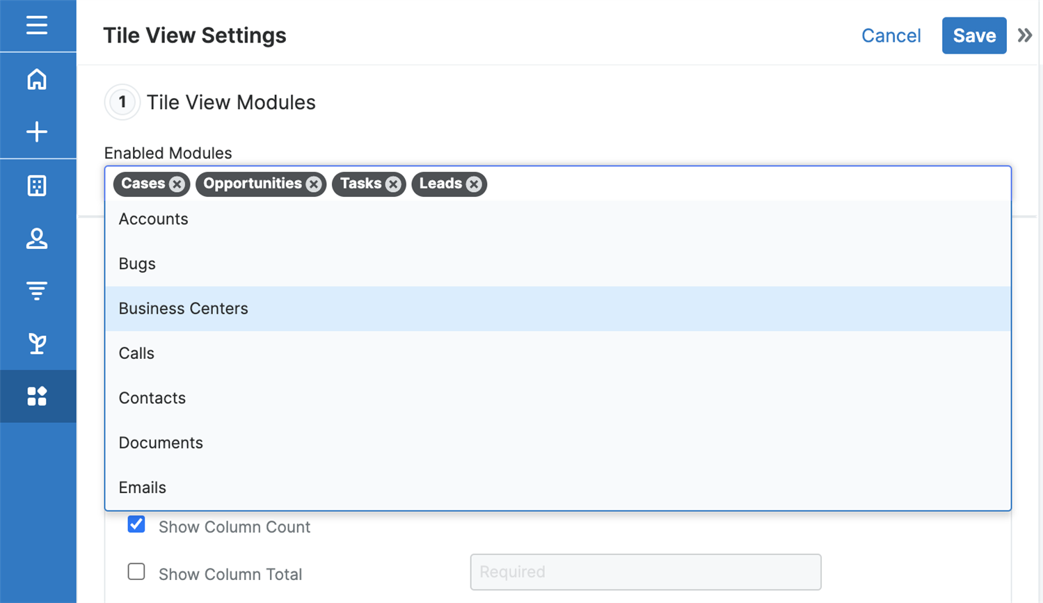 Prior to the 13.1 version, Tile View (TV) only allowed users to visualize and engage within four modules: Cases, Opportunities, Tasks, and Leads. Starting with the Q3 2023 release, we have made enhancements to the TV interface, enabling users to consume and update information in a visual, user-friendly way for all sidecar modules with dropdown values, except the Reports module.